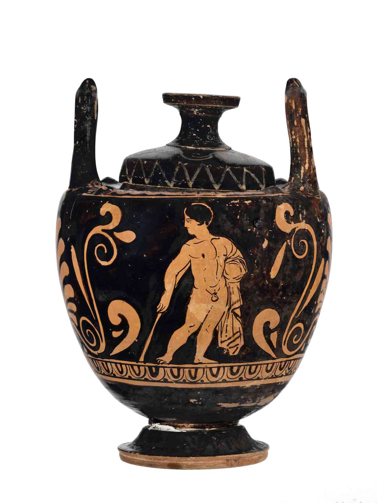 Argilla rosata (7.5 YR 7/4 Munsell); la vernice è lucente, di buona qualità, generalmente ben conservata ma scalfita, diluita abrasa in alcuni punti, per cui le immagini sovraddipinte si rivelano di difficile lettura. Si rilevano, inoltre, alcune piccole zone che evidenziano problemi di cottura. Il vaso presenta un corpo globulare leggermente rastremato nella parte bassa, con un'imboccatura non molto larga, su cui si imposta un breve labbro verticale. Sulle spalle del vaso sono presenti, su entrambi i lati, due piccole protuberanze, che sembrano quasi delimitare l' area sottostante, destinata alla decorazione figurata. Il vaso presenta poi una vasca non molto profonda, con fondo arrotondato che poggia su un piede a campana, delimitato superiormente da una sottile modanatura, la quale si ripresenta anche sul bordo superiore dello spessore del piede. Il vaso presenta, impostate verticalmente sulla spalla, alte anse a bastoncello, sulla cui sommità sono presenti delle piccole protuberanze. Decorazione del lato A: è raffigurata una figura femminile con il volto di profilo e i piedi rivolti verso sinistra, e con il corpo e le gambe di prospetto; porta i capelli raccolti in un sakkos ed è vestita di un chitone smanicato ricco di drappeggi che, stretti alla vita, le segnano le linee del corpo. A sottolineare le pieghe della stoffa vi sono delle sottili bande più scure. La donna tiene il braccio sinistro sospeso elegantemente a mezz'aria, mentre tiene stretta nella mano destra una colomba. Ai suoi piedi, sulla sinistra, è raffigurata una piccola cassetta. Decorazione del lato B: la scena mostra un giovane nudo, con il volto di profilo verso sinistra e con il corpo e le gambe di prospetto, che porta i capelli corti, con una ciocca che gli ricade all'altezza degli zigomi. L'unico indumento è il mantello, portato sulla spalla e sul braccio sinistri per poi ricadere lungo il fianco, i cui drappeggi sono sottolineati lungo il bordo inferiore da una banda più scura. Nella mano destra il giovane regge un bastone a metà altezza. La decorazione accessoria è costituita da due palmette tra girali fogliati, che riempiono lo spazio sotto le anse. Un sottile filetto risparmiato corre lungo la linea ideale tra le due protuberanze sulla spalla; alla base delle scene figurate, sotto un ulteriore filetto risparmiato che funge quasi da linea di appoggio per le figure principali delle scene, corre lungo tutta la circonferenza del vaso una fascia decorata dalla sequenza ovulo-guscio e puntino, sottolineata da un'altra spessa linea risparmiata. Un sottile filetto graffito decora il punto di stacco tra ventre e piede. Il coperchio è in argilla rosata (7.5 YR 7/4 Munsell) e presenta un foro rotondo sull'estremità superiore della presa cilindrica, staccata dal coperchio per mezzo di una modanatura sottilissima sottolineata da un filetto graffito. Vi è una seconda modanatura sottilissima proprio nel punto di attacco tra il corto stelo della presa ed il coperchio. È presente, attorno al foro sulla presa, una decorazione a linee radiali, mentre la base del coperchio è ornata con una linea continua a zig zag, che corre lungo tutta la circonferenza.