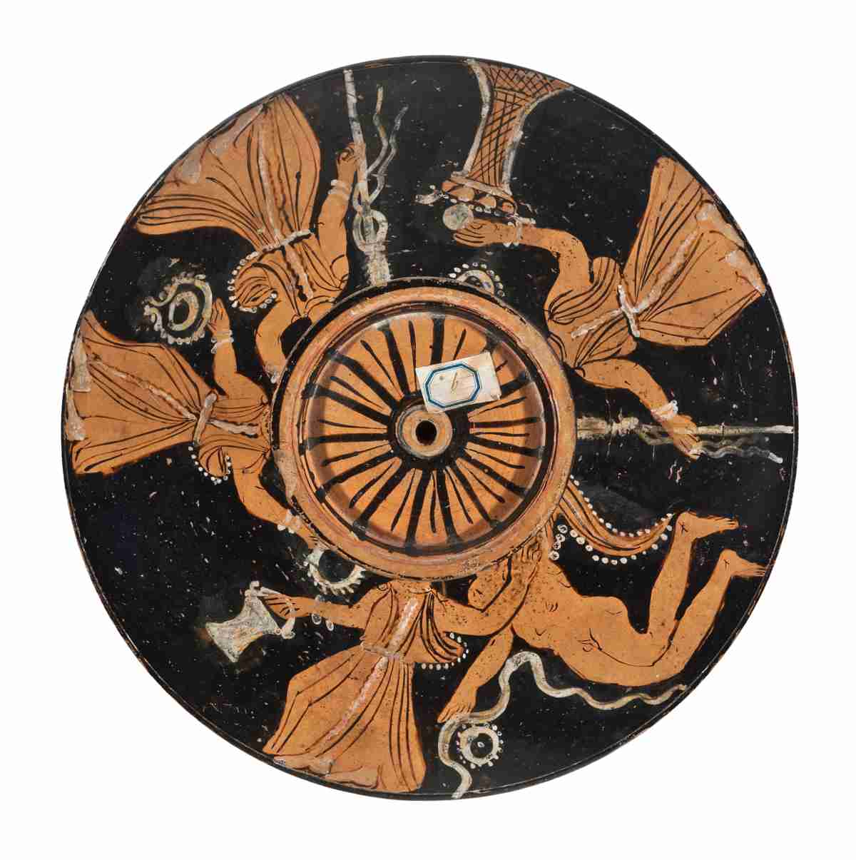 Il coperchio, pertinente alla lekanis 5387, presenta una forma tronco-conica, con un alto stelo verticale. La presa ha un'impugnatura modana-ta, dall'alto orlo piatto, rilevato e con scanalatura circolare; di profilo presenta un listello aggettante, una fascia a profilo tronco-conico rovesciato ed un elemento ad echino. Lo stelo si attacca al coperchio con un listello a rilievo. La vernice nera è piuttosto opaca, uniforme sul corpo e all'interno e visibilmente diluita sullo stelo del manico; molti dettagli e soprattutto gli attributi sono resi con sovradipinture bianche, in molti casi parecchio sbiadite. Il colore dell'argilla è Munsell 5YR 6/6 (reddish yellow). La decorazione principale, che si sviluppa attorno allo stelo, è a tema dionisiaco ed è composta da un erote alato e quattro menadi danzanti, incedenti in senso orario, dalle proporzioni piuttosto approssimative e dettagli molto semplici e corsivi. L'erote alato è nudo, di profilo a sinistra, di dimensioni sensibilmente più grandi rispetto alle menadi: occupa l'intero spazio destinato alla decorazione figurata, ma le gambe, di profilo, sono flesse, come fosse in ginocchio. Anche l'ala è flessa e di profilo, decorata con motivi lineari bianchi e neri ed è orlata da una fila di punti bianchi. La figura porta i capelli raccolti in un sakkos ornato da perline e sovradipinto in bianco e sorregge con il braccio destro, l'unico visibile, un serto e una tenia, anch'essi in bianco. Si nota l'assenza del braccio sinistro, che dovrebbe essere in primo piano: al suo posto una fila di linee arcuate, forse linee guida per la pittu-ra del braccio stesso. Le quattro menadi risultano vestite tutte in maniera molto simile: capelli raccolti nel sakkos, in alcuni casi ornato da perline e sempre sovradipinto in bianco, lungo chitone smanicato e fissato sulle spalle da fibule, cinto in vita da una cintura e ornato da una linea verticale (le cinture e le linee verticali dei chitoni sono sovradipinte in bianco); in quasi tutti i casi, l'orlo svolazzante del chitone è ornato da una fila di perline. Le fanciulle portano inoltre una collana di perle e bracciali, tutto reso in bianco; i piedi, pur molto sbiaditi, erano anch'essi bianchi, forse ad indicare dei calzari. Procedendo in senso orario, la prima menade, perfettamente di profilo e incedente verso sinistra, regge una situla, sovradipinta in bianco, nella destra e porta il braccio sinistro all'indietro, a toccare la spalla destra dell'erote. La successiva, di profilo e incedente verso sinistra, ha però il volto rivolto verso destra; in entrambe le mani, la sinistra protesa all'indietro, regge un serto reso in bianco. La terza menade, di profilo e incedente verso sinistra, regge un tirso con una tenia, sovradipinto in bianco, nella destra e porta la sinistra a toccare la nuca della menade precedente. La quarta e ultima menade, incedente e di profilo a sinistra, non presenta ornamenti sull'orlo svlolazzante del chitone; con la mano destra regge un tirso con una tenia, mentre con la sinistra appoggia un offerta, forse un uovo, su un altarino in forma di cesta rovesciata. L'altarino presenta già alcune offerte, in particolare dei fichi, e i suoi contorni sono sovradipinti in bianco. In alto a destra della figura, compare, sospesa, una ghirlanda. La decorazione accessoria comprende un motivo raggiato sotto al piede, dipinto in nero, composto da un cerchio centrale, con quindici raggi più spessi alternati ad altrettanti raggi più sottili. Lungo l'orlo compare un motivo a onde marine rovesciate sinistrorse. All'interno si conserva una vecchia etichetta recante, tra le altre cose, anche la data di acquisizione da parte del museo ('7743 16 febbraio 1904 N1 coperchio') e un'altra sul manico ('9').
