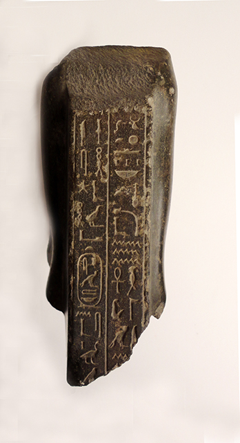 Questo tipo di statua prevedeva che il titolare delle iscrizioni fosse ritratto in piedi o in ginocchio, nell’atto di presentare il naos. Questo frammento consiste purtroppo soltanto della parte inferiore della statua, troncata a metà delle gambe e con la gamba sinistra portata in avanti (convenzione che indica l’incedere del personaggio). Della figura dell’uomo rimangono la mano sinistra, una parte delle gambe e parte del pilastrino posteriore di sostegno. La mano sinistra regge il naos con l’immagine del dio Ptah al quale manca una parte della superficie laterale destra. Il dio Ptah è raffigurato secondo la maniera tradizionale: eretto, mummiforme, la barba divina al mento, lo scettro uas tra le mani e terminante sull’estremità dei piedi. Sul retro, sulla superficie del pilastro dorsale, i resti di una iscrizione geroglifica in due colonne.