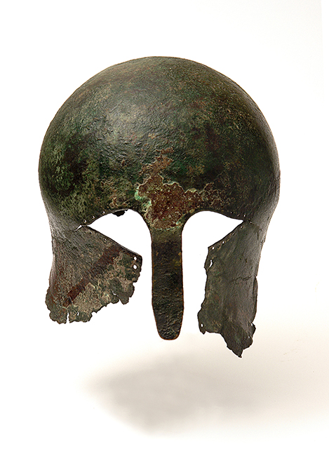 Elmo greco a calotta emisferica, con aperture per gli occhi separate dalla appendicel nasale allungata dalla punta arrotondata e dale paragnatidi. Decorato con puntinatura sorpa e sotto l'occhio e lungo l'orlo delle paragnatidi e della parte posteriore; presenta inoltre alcuni fori per il fissaggio delle parti in cuoio. La provenienza da Olimpia si inserisce tra i ritrovamenti, negli scavi, di un gran numero di elmi (più di 200): si tratta della decima del bottino sottratto ai nemici sconfitti e offerta alle divinità in ringraziamento per la vittoria ottenuta. Erano posti a formare trofei che ornavano i santuari, la cui esistenza è testimoniata dalle fonti antiche.