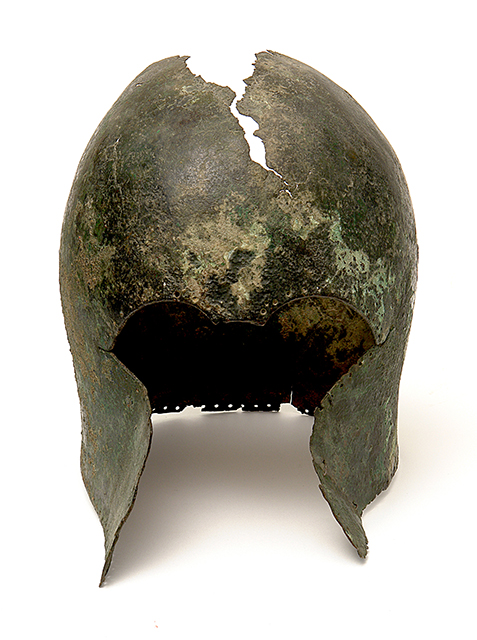 Elmo greco a calotta emisferica, con aperture per gli occhi separate dalla appendicel nasale allungata dalla punta arrotondata e dale paragnatidi. Decorato con puntinatura sorpa e sotto l'occhio e lungo l'orlo delle paragnatidi e della parte posteriore; presenta inoltre alcuni fori per il fissaggio delle parti in cuoio. La provenienza da Olimpia si inserisce tra i ritrovamenti, negli scavi, di un gran numero di elmi (più di 200): si tratta della decima del bottino sottratto ai nemici sconfitti e offerta alle divinità in ringraziamento per la vittoria ottenuta. Erano posti a formare trofei che ornavano i santuari, la cui esistenza è testimoniata dalle fonti antiche.