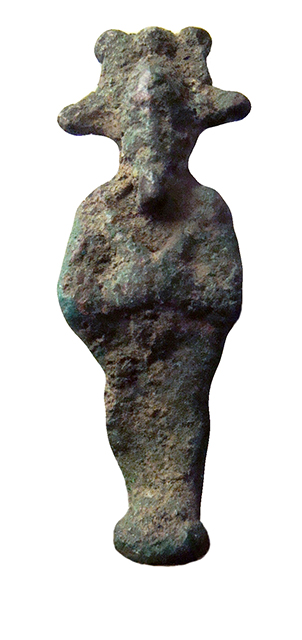 Amuleto in bronzo raffigurante il dio Osiride, dalla superficie molto consunta. Secondo la consueta iconografia, il dio è raffigurato stante, con il corpo mummiforme da cui escono solo le mani, che reggono scettro e flagello, e la testa, sulla quale vi è la corona atef. Al mento vi è la solita barba divina posticcia. Sotto i piedi vi è un perno, attualmente inserito in una base di legno.