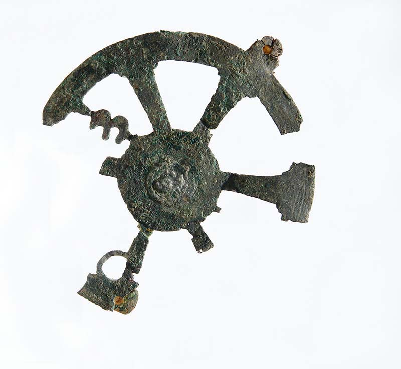 Cerchio di lamina con due forellini, in alto e in basso, per il fissaggio. Racchiude un Chrismon raggiato con appese le lettere apocalittiche alfa (a sinistra) e omega (a destra). I raggi sono perduti.