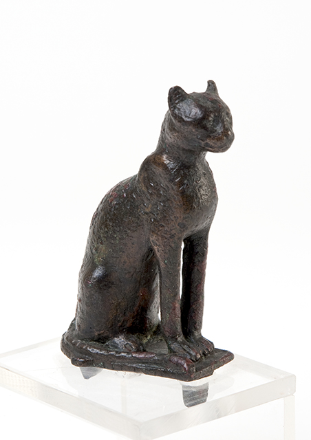 I bronzetti raffiguranti gatti, ed in particolare quelli di piccole dimensioni, sono un esempio dell’attenzione che gli antichi egiziani riservavano all’ambiente naturale ed agli animali che li circondavano. L’anatomia è resa in modo accurato: i felini, dal corpo snello, sono ritratti seduti sulle zampe posteriori, con la coda che aderisce al lato destro del corpo fino a raggiungere le sottili zampe anteriori. I musi sono appuntiti e le orecchie grandi. Statuine di questo tipo diventano comuni a partire dall’Epoca Tarda (715-332 a.C.), dal momento che il culto degli animali sacri (il gatto era legato infatti alla dea Bastet) cominciò in quel periodo a diffondersi sempre più.