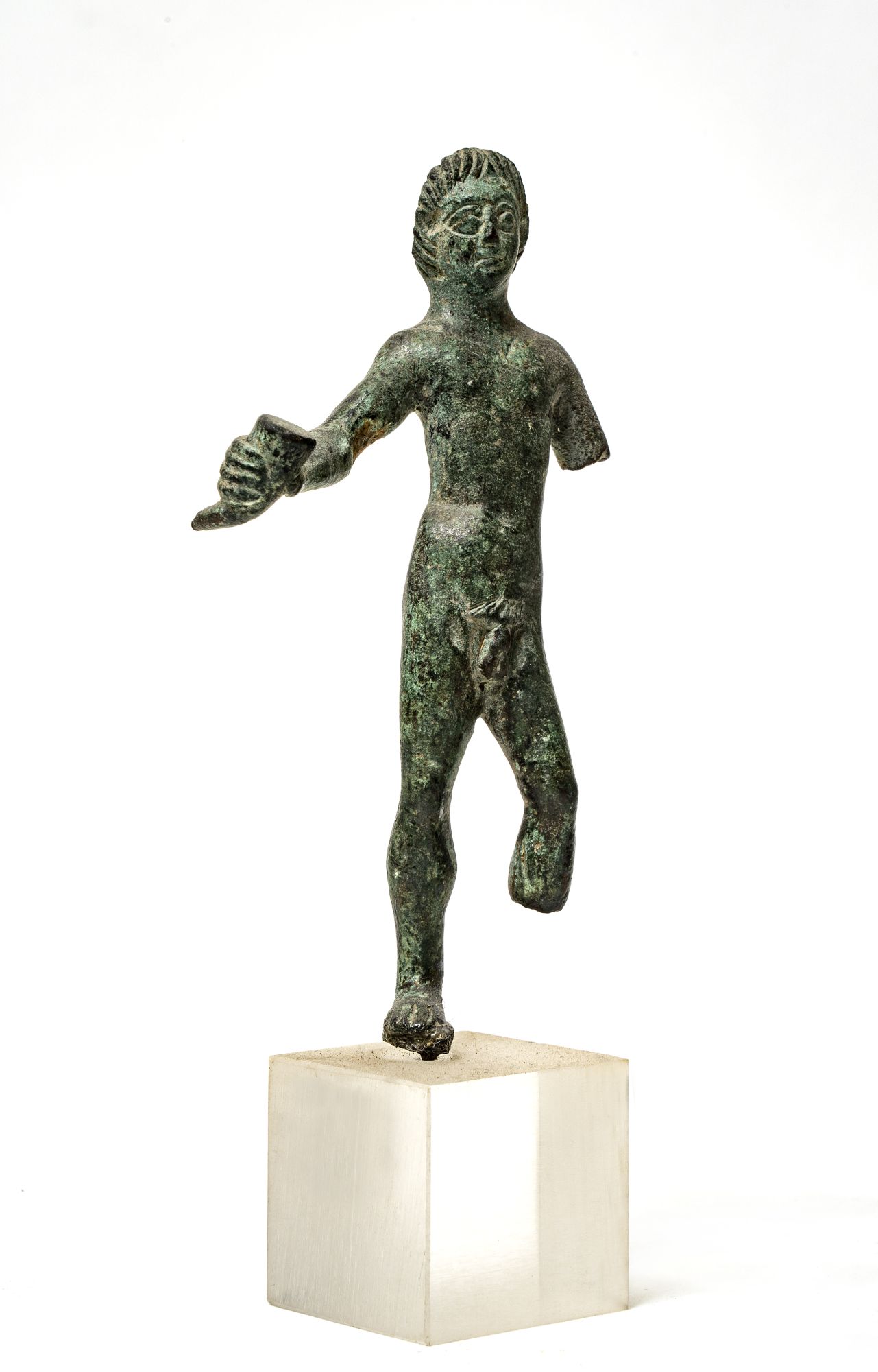 Statuetta d'Ercole nudo e imberbe. Nella mano destra protesa un rython. Il corpo piatto insiste leggermente sul fianco destro. I capelli sono cesellati a righe parallele che si dipartono da un unico centro e ricadono a franfia sulla fronte. Patina verde.