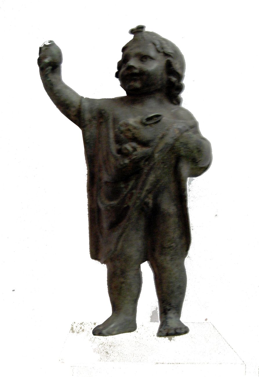 Figuretta di putto stante sulle gambe leggermente divaricate che indossa il tipico mantello da viaggio, una paenula. Il braccio è destro alzato con frutto nella mano (forse melagarana) il sinistro, aderente al busto, sostiene un leprotto.