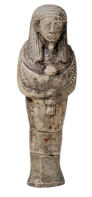 Statuina funeraria mummiforme, di aspetto insolito rispetto agli altri esemplari con la stessa iconografia, indossa un collare sul quale si intravedono ancora tracce di colore rosso e nero, la barba divina ed una parrucca tripartita nera, chiusa da fermagli. Tra le mani tiene un ba, che appoggia le sue ali spiegate sul petto della statuina. Dalla spalla destra pende una sacca. Non si vedono tracce di iscrizione, ma questa era probabilmente semplicemente dipinta, verosimilmente su fondo giallo (come sembrano suggerire poche tracce di colore).
