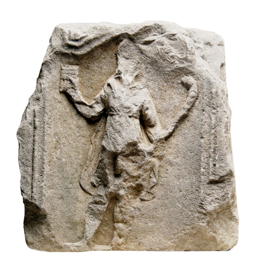 Cornice di tipo norico-pannonico che racchiude la figura in rilievo del dio Attis stante, vestito di tunica e mantello con il caratteristico berretto frigio, mentre regge nella destra una siringa e nella sinistra un bastone ricurvo.