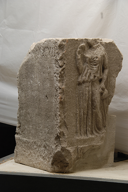 Cippo squadrato con sulla fronte l'indicazione delle misure dell'area sepolcrale e sui due lati, in rilievo, figura femminile alata che regge un urceus. L'iscrizione latina è di tipo sepolcrale.