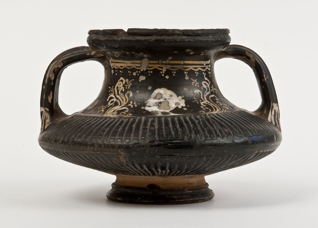 Anfora conica con testa femminile a vernice nera con sovraddipinture in bianco e giallo. Labbro con taglio modanato, orlo leggermente rigonfio ed estroflesso, collo a profilo concavo, corpo lenticolare strigliato, con fascia liscia tra le strigliature, anse a nastro verticali e tricostolate, bassa gola di raccordo, piede troncoconico modanato. A: sotto l'orlo coppia di linee orizzontali, linea ondulata e e gruppi di tre punti, dipinti in giallo, su base bianca. Testa femminile indistinta, di profilo verso sinistra, tra complessi di girali e fiori campanulati, in giallo. B: sul collo ramo secco orizzontale con foglie a trattini in giallo da cui si distaccano, sia verso l'alto che verso il basso, due rami secondari desinenti con elemento a palmetta stilizzato. Sulla parte finale delle anse bastoncelli bianchi pendenti da una linea orizzontale dipinta in giallo su base bianca; sulla parte liscia tra le strigliature fila di punti in bianco.