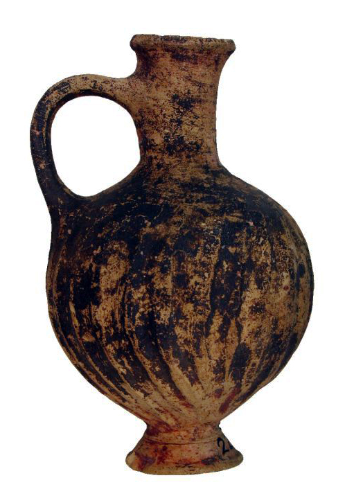 Olpe a vernice nera priva di sovraddipintura con corpo scanalato verticalmente ad onde; su piede, con alto collo, corpo globulare, ansa ad anello.