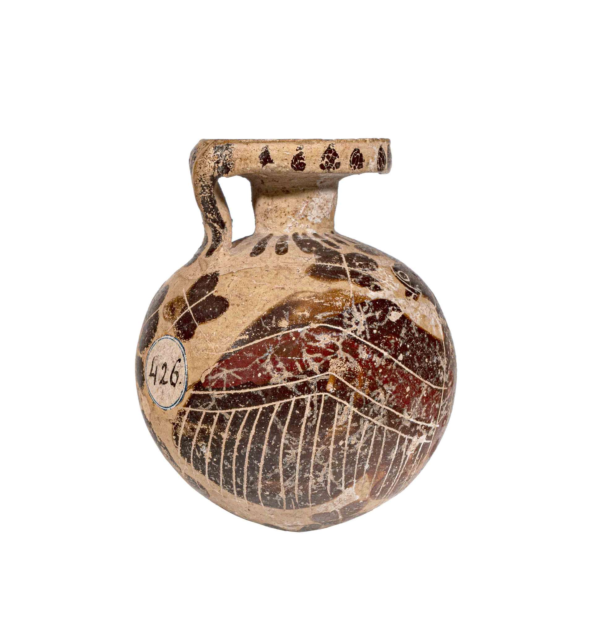 Aryballos corinzio con uccello verso sinistra, forse un gallo ad ali spiegate; nel campo rosette, sul fondo raggiera di petali.