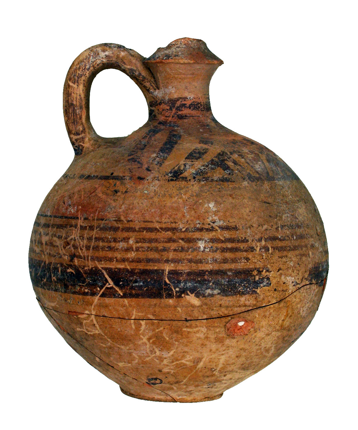 Amphoriskos a corpo globulare con base piana, collo stretto e ansa anulare; decorazione a linee e una fascia nera sul ventre, ovuletti sulla spalla.