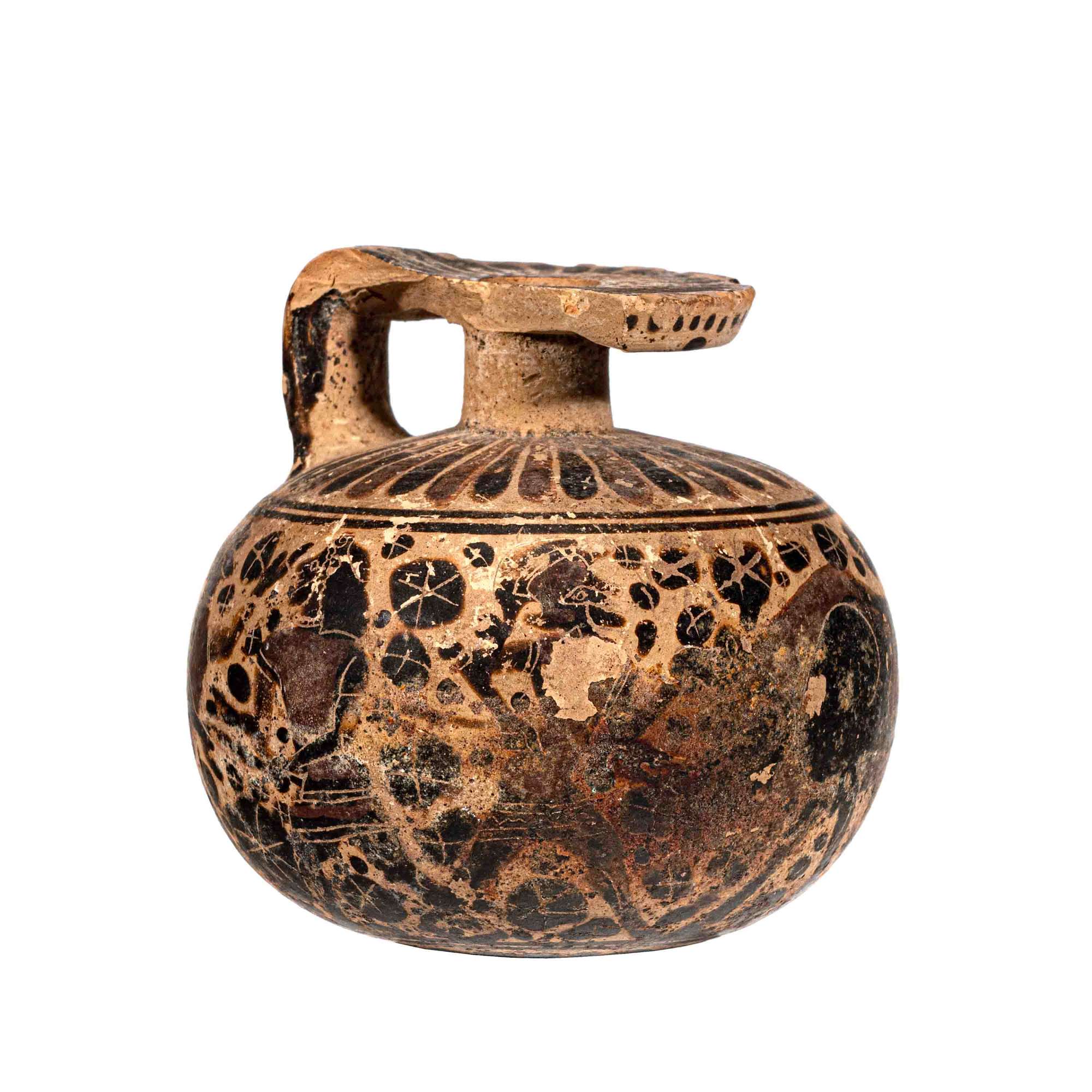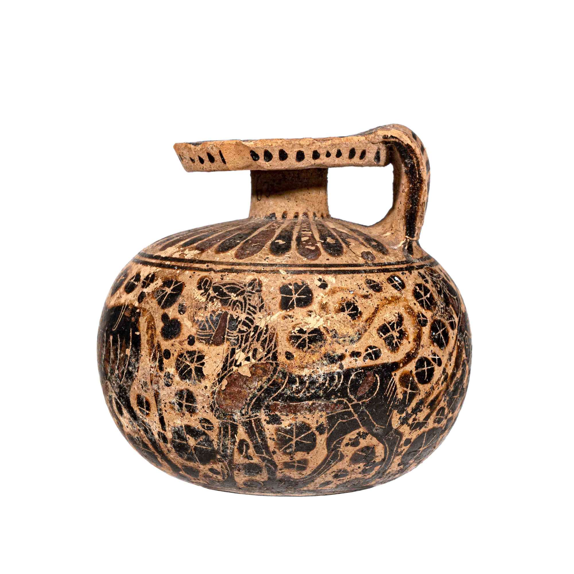 Aryballos corinzio con pantera, guerrieri e toro tra rosette.