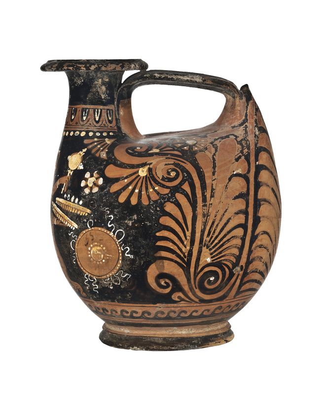 Askos apulo a figure rosse con colori sovraddipinti a corpo globulare e ansa a nastro. Sulla fronte Eros androgino in volo con specchio e due patere; antefissa a palmette sotto l'ansa.