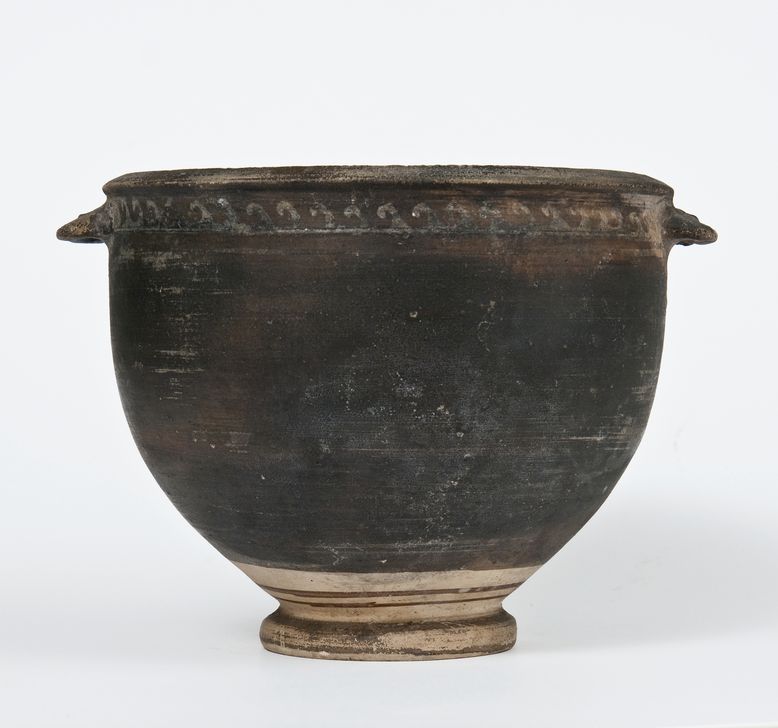 Bacino a vernice nera, tendente al bruno, con sovraddipinture in bianco e giallo. Labbro leggermente revoluto, orlo leggermente introflesso, corpo emisferico, anse ad orecchie, entrambe forate verticalmente, piede ad anello. A: Sotto l’orlo onda sinistrosa e spessa linea dipinta in giallo su base bianca. B: Sotto l’orlo linea in giallo su base bianca e fila di punti.