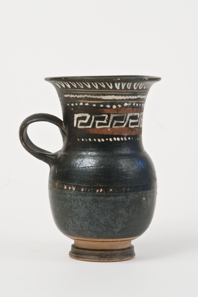 Boccaletto a vernice nera con sovraddipinture in bianco crema, giallo e rosso amaranto ed incisioni. Labbro espanso, orlo estroflesso, collo troncoconico, corpo ovoidale, ansa a nastro e ad anello schiacciato impostata ad attacco verticale tra il collo ed il corpo, bassa gola di raccordo, stretto piede troncoconico modanato. A partire dall'orlo, dall'alto verso il basso: una linea incisa, una sequenza di ovuli dipinti in bianco, due coppie di linee incise che racchiudono un tremulo in bianco crema, una fila di punti in bianco-giallo e, tra due fasce in rosso amaranto, meandro in bianco crema; chiude la decorazione un'altra fila di punti.