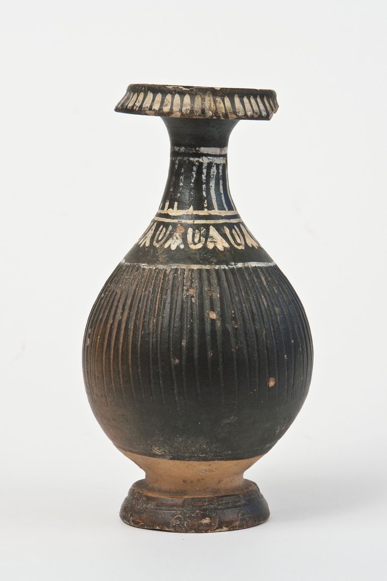 Bombylios o unguentario a bottiglia a vernice nera con sovraddipinture in bianco e giallo. Labbro revoluto, orlo estroflesso, stretto collo a profilo concavo, corpo globulare strigilato, bassa gola di raccordo, piede troncoconico modanato. Sul labbro: bastoncelli brevi e sul collo, bastoncelli fra due linee in giallo. Sulla spalla: sequenza di ovuli con bastoncelli centrali alternati a foglie di edera, in giallo. Il corpo strigilato è delimitato, al di sopra e al di sotto, da linee orizzontali bianche.