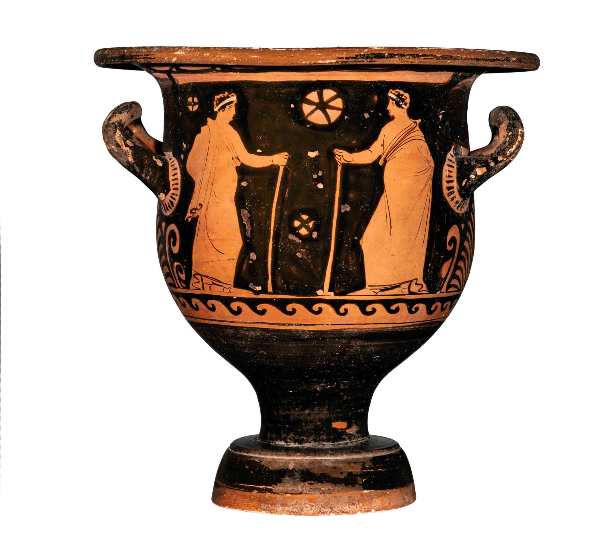 Cratere a campana apulo a figure rosse; fascia con serto di alloro sotto il labbro e ad onda marina sotto le scene figurate. Lato A: giovane nudo con tirso e grappolo; fanciulla con grappolo e patera; albero. Lato B: due giovani ammantati con bastone.