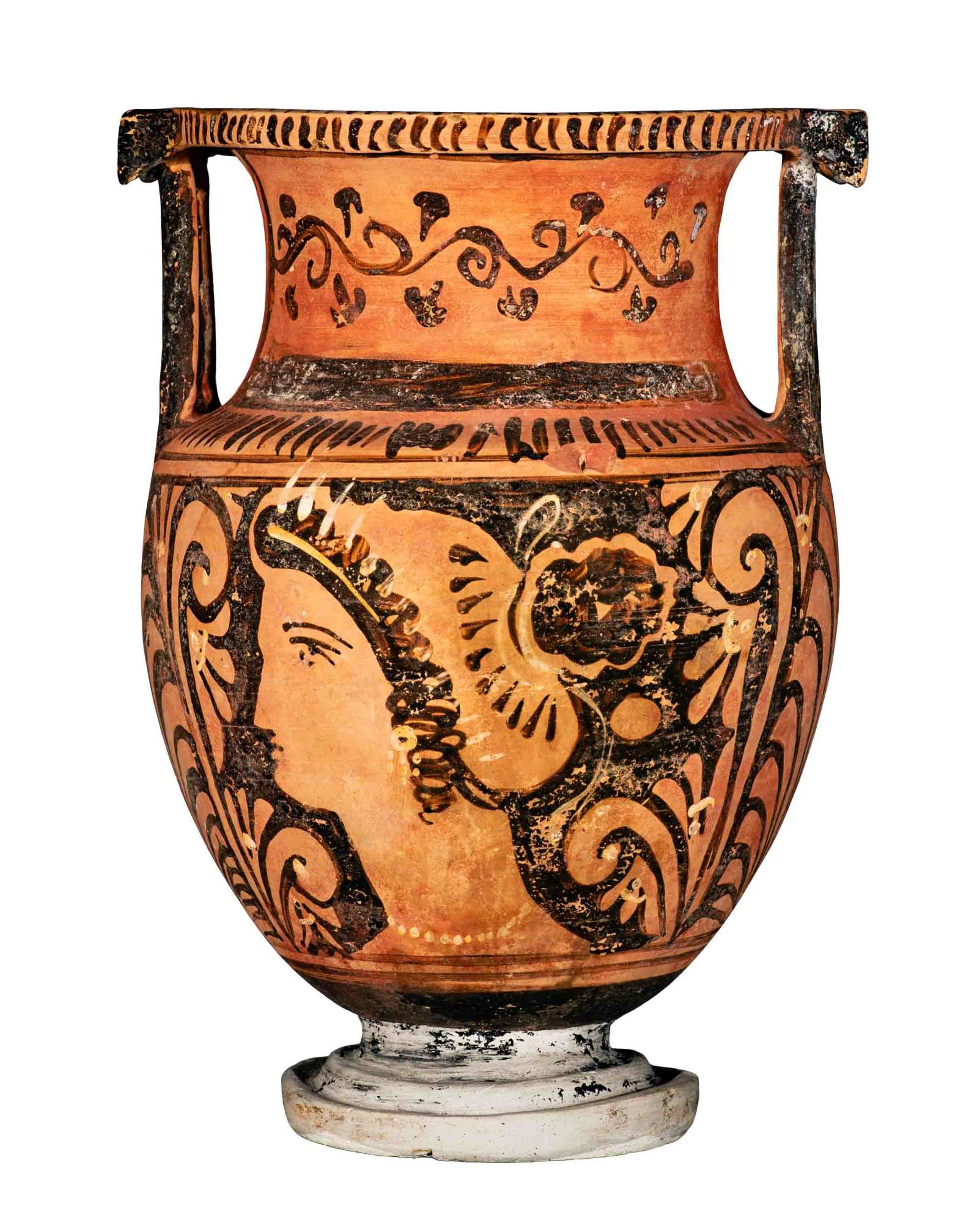Cratere a colonnette apulo a figure rosse. Sul collo serto d'edera nero su fondo rosso. Lato A e B: testa femminile con mitella tra palmette.