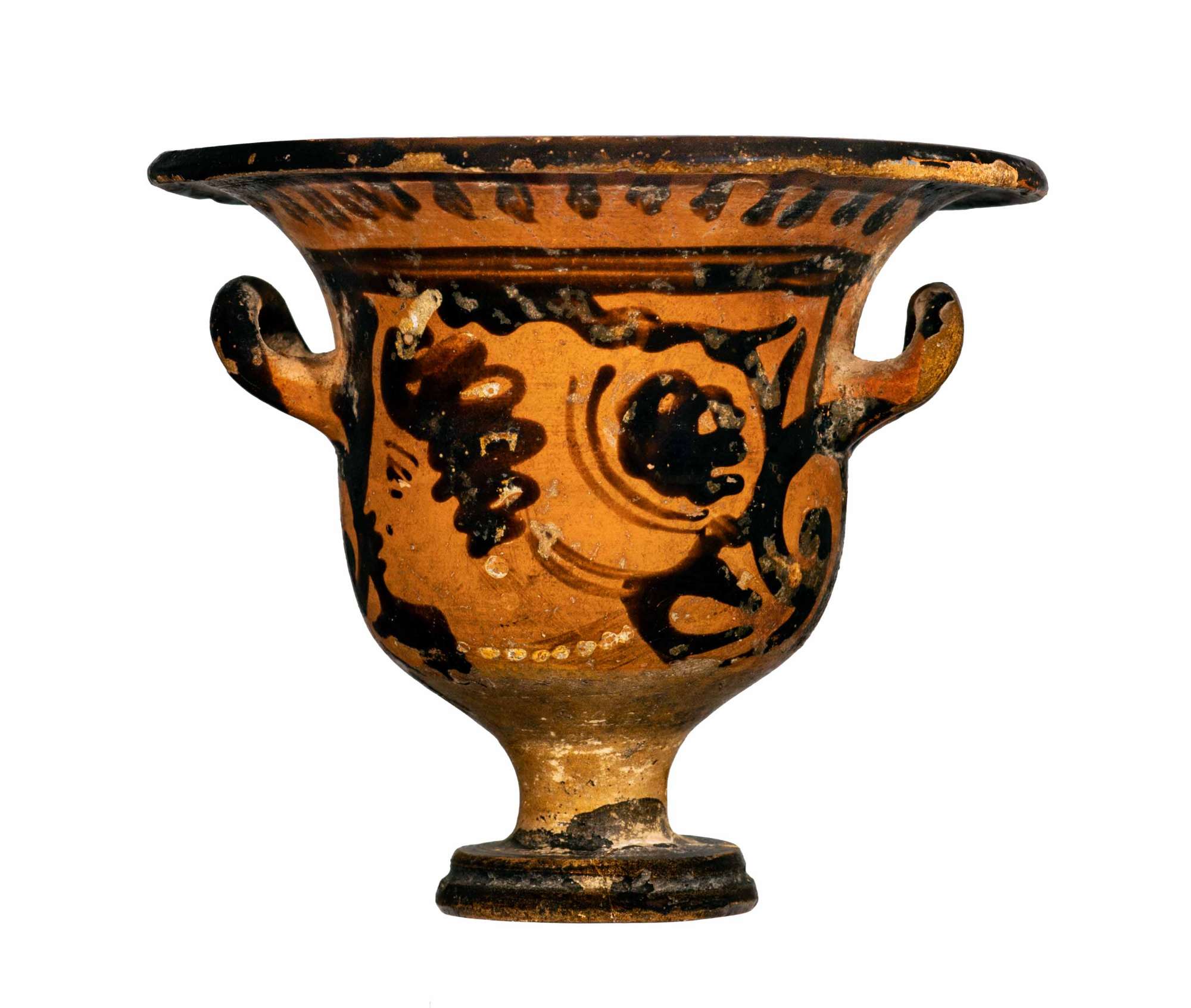 Cratere miniaturistico a campana. Labbro arrotondato leggermente ripiegato verso il basso, orlo estroflesso molto pronunciato; vasca campaniforme; anse a sezione circolare impostate orizzontalmente e ripiegate verso l'alto; piede ad echino cavo con mondatura a cavetto sul bordo superiore. Lato A: testa femminile con stephanè. Testa femminile di profilo rivolta verso sinistra. Fronte e naso costituiti da un’unica linea continua appena bombata sulla fronte; occhio con dettaglio di palpebra superiore e inferiore e sopracciglio. Appena al di sopra del labbro superiore, piccolo neo CIRCOLARE in nero. I capelli sono raccolti in una mitra, bordata alle estremità da una doppia linea in vernice diluita, cui è sovrapposta una stephanè ad altri raggi in giallo sovradipinto.; i gioielli, orecchini e collana ad un unico filo di vaghi ovali, sono in giallo sovradipinto. Lato B: testa femminile con stephanè Testa femminile di profilo rivolto verso sinistra, simile per rappresentazion a quella del lato Am ma con, appena al di sopra del labbro superiore, piccolo neo TRIANGOLARE in nero.