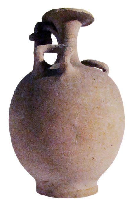 hydria con corpo globulare, alto e sottile collo cilindrico, con labbro a profilo diritto e orlo appiattito, con due piccole anse a nastro impostate verticalmente sulla spalla e un’ansa impostata tra l’orlo e la spalla, decorata con nastro, piede troncoconico a profilo diritto.