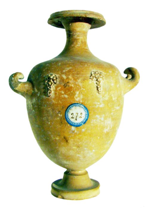 hydria con bocchello troncoconico leggermente svasato, collo a profilo concavo, spalla arrotondata, corpo globoso, piede ad anello modanato con gola d’attacco. Sulla parte anteriore del corpo, due piccoli grappoli d’uva applicati. Tracce di vernice rosso-arancio sull’orlo, su quasi tutto il corpo e il piede.