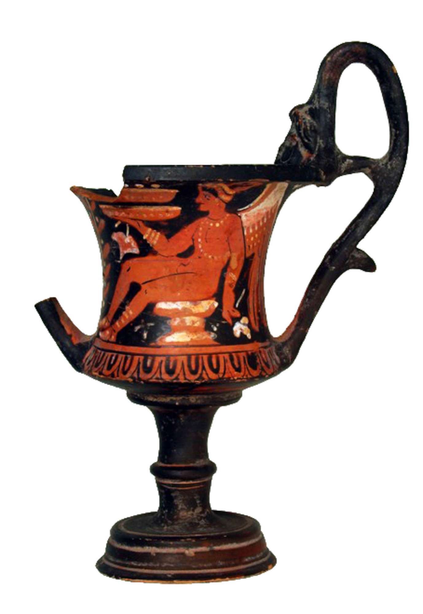 Orlo svasato con labbro estroflesso; bicchiere a profilo concavo con protomi antropomorfe all’attacco delle anse superiori e con linguette in prossimità dell’attacco inferiore. Lato A: figura femminile seduta con specchio, cista e benda Figura femminile di tre quarti verso destra, retrospiciente e seduta su roccia a più piani sovradipinti in bianco; regge nella destra sollevata uno specchio con dettagli sovradipinti in giallo; nella s. tiene una cista con croce di Sant’Andrea a vernice nera e una benda con dettagli in giallo alle estremità (in parte evanidi); indossa un lungo chitone allacciato sulle spalle e stretto in vita con una cintura in bianco sovradipinto con fiocco; capelli raccolti in una mitra decorata con linee in bianco sovradipinto. In bianco sovradipinto anche gli orecchini, l’armilla al polso, la collana ad unico filo di vaghi circolari pendenti e decorazioni sulle embades ai piedi. Sulla linea di terra, a sinistra., coppia di fiori a campanula profilati in bianco e alternata a puntini sovradipinti. Nel campo, in basso, crocetta in bianco sovradipinto; in alto a d. benda appesa in giallo sovradipinto. Lato B: erote seduto con coppia di patera e foglie d’edera Erote di tre quarti verso sinistra con testa di profilo, seduto su roccia a più strati campiti in bianco. Regge nella destra due phialai sovrapposte profilate e decorate con fila di punti in giallo sovrapposto; sempre nella d. foglia d’edera profilata in bianco. La s. appoggiata indietro stringe una foglia in bianco sovradipinto. L’erote, nudo, è caratterizzato da numerosi dettagli sovradipinti: porta i capelli raccolti in una mitra puntinata in giallo; le ali campite in bianco nella parte superiore e con i particolari del piumaggio a vernice nera nella parte inferiore. Orecchini a due grani pendenti, armilla al pols, collana a due file di vaghi circolari – uno girocollo, l'altro a tracolla e ricadente sul petto –, decorazione sulla coscia (ormai evanida), cavigliera rigida a più cerchi e decorazioni sulle embades ai piedi, tutti in giallo sovradipinto. Sulla linea di terra, a sinistra arbusto con coppie di foglie lanceolate alternate a coppie di puntini in giallo sovradipinto. Nel campo, al di sotto delle gambe, crocetta in bianco sovradipinto (in parte evanido).