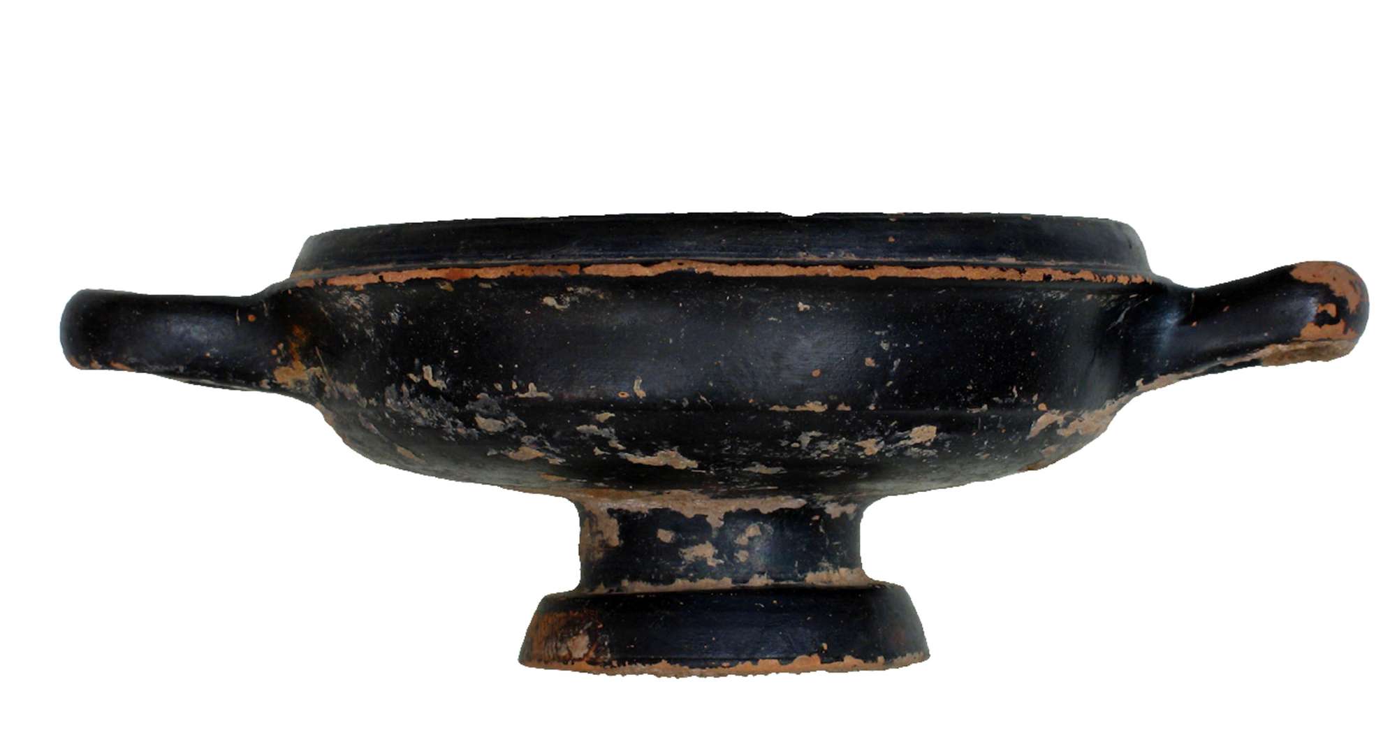 Coppa di lekanis apula a vernice nera con basso stelo e largo piede.