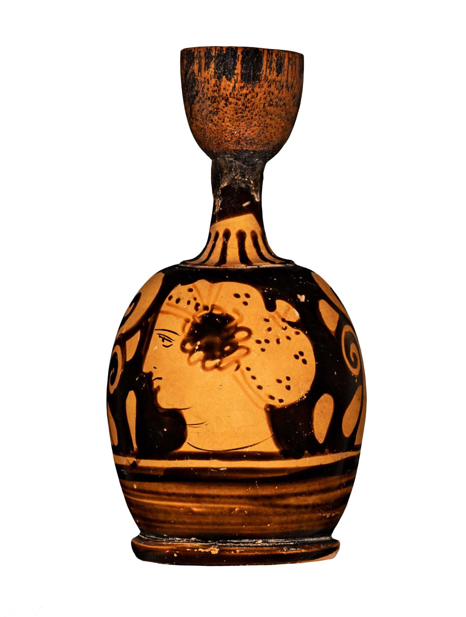 Collo affusolato distinto dalle spalle orizzontali da un sottile cavetto; corpo globulare La parte inferiore del collo decorata con corona di linguette a vernice nera entro fascia risparmiata. Sui lati, elementi vegetali con coppia di foglie. Lato A: testa femminile di profilo con sakkòs. Testa femminile di profilo, rivolta verso sinistra. L’occhio è reso con sopracciglio, palpebra, rima inferiore e superiore non coincidenti e pupilla pendente dalla rima superiore; la narice è definita da un brevissimo tratto a vernice nera; labbro superiore e inferiore distinti da un sottile tratto leggermente curvato verso il basso. Due sottili linee nere, leggermente ricurve verso l’alto, a metà collo circa; poco più in basso, girocollo costituito da un unico filo a vernice nera. I capelli acconciati e racchiusi in un sakkòs, decorato con file e gruppi di tre punti in nero e bordato da linee continue a vernice nera molto diluita; all’altezza dell’orecchio, fuoriesce dal sakkòs una ciocca di capelli ricci.