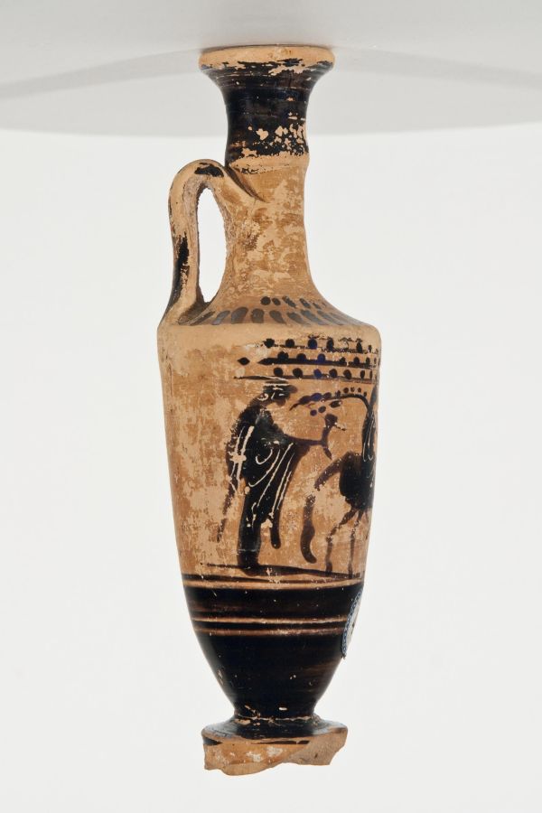 Lekythos attica a figure nere con graffito. Corteo con Dioniso, menade e satiro. A sinistra è rappresentato Dioniso rivolto verso destra, porta i capelli lunghi ed indossa un chitone ed un lungo himation drappeggiato, con la mano destra tiene un kantharos. Al centro della scena si vede una menade sopra un asino. E' vestita con un chitone ed himation drappeggiato. Davanti a loro un satiro avanza verso destra, volto indietro. Sullo sfondo corrono tralci con foglie a puntini. A graffito vengono indicati sommariamente i drappeggi delle vesti ed alcuni particolari interni.