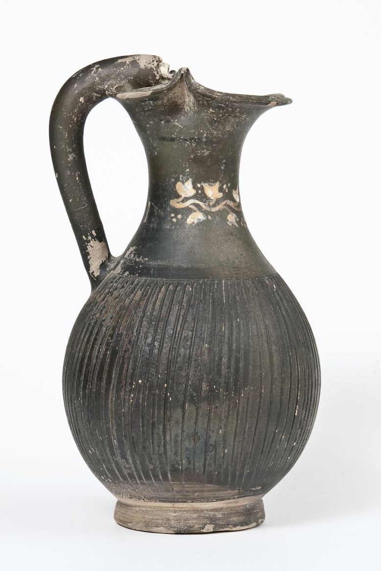 Oinochoe a vernice nera, tendente al grigio, con sovraddipinture in bianco e giallo. Labbro modanato, orlo estroflesso e trilobato, collo a profilo concavo, corpo globulare strigilato, ansa a bastoncello verticale, desinente alla sommità, nel punto d’attacco all’orlo, in una protome ferina, piede ad anello. Sul collo: tralcio di edera con stelo sinuoso dipinto e corimbi a tre punti in giallo su base bianca.