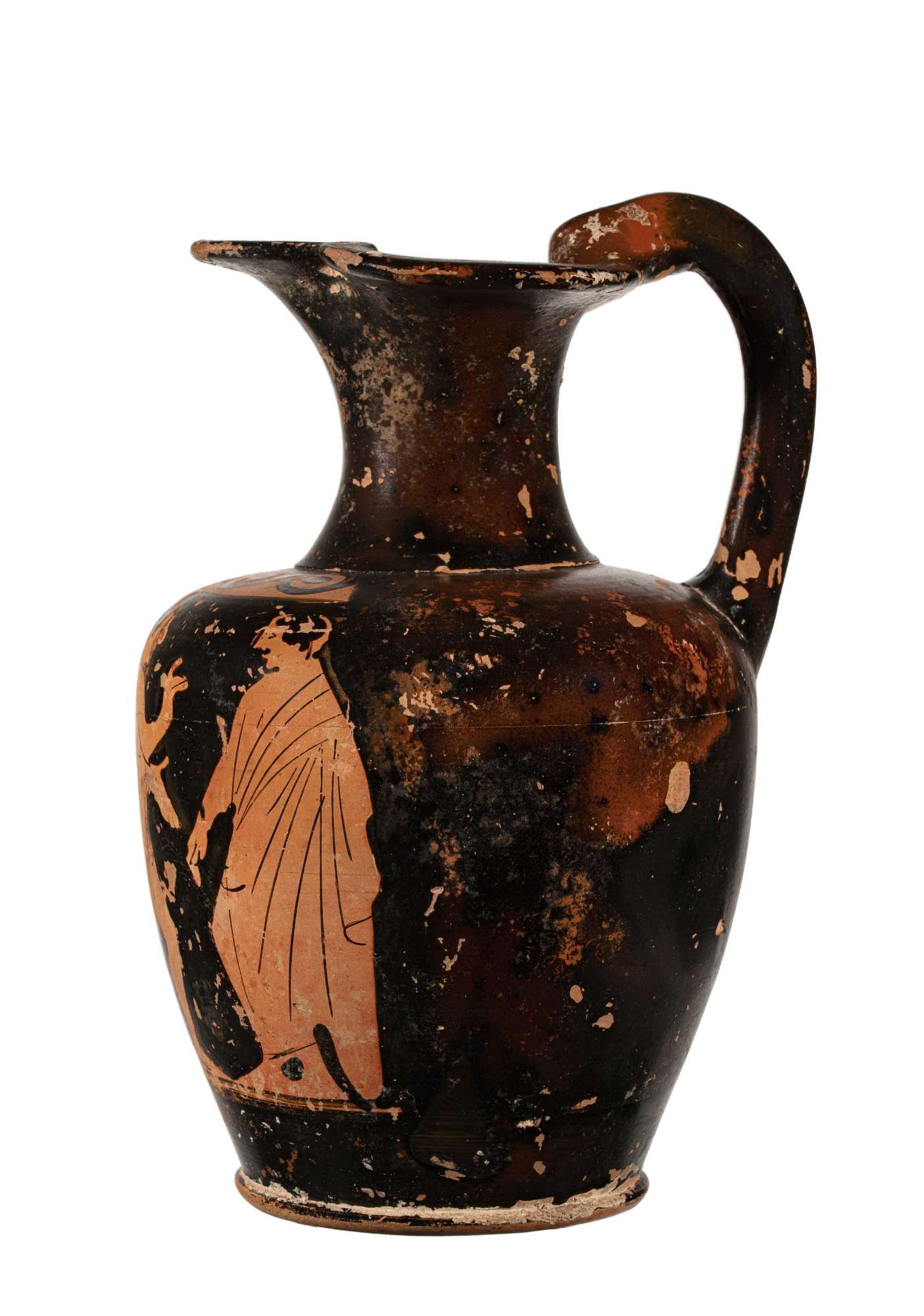 Bocca trilobata con labbro arrotondato; Sulle spalle, in coincidenza della scena figurata, serie di quattro onde correnti verso destra lasciate a risparmio. Lato A: tre giovani a colloquio Sulla siniatra giovane ammantato, stante,è rivolto di profilo verso destra con l’avambraccio d. sollevato, nell’atto di parlare; indossa un himation lungo fino alle caviglie che lascia scoperti i piedi scalzi. Replica la stessa posa, ma con ponderazione delle gambe opposta, anche il personaggio al centro, ritratto, differentemente dai compagni, in completa nudità. Sulla destra giovane ammantato, stante, è ritratto di profilo verso sinistra con il braccio, lasciato scoperto dall’himation, pronto a sollevarsi; i piedi, scalzi, rimangono visibili al di sotto del mantello. Le condizioni di abrasione della superficie pittorica non consentono ulteriori dettagli sui visi dei personaggi, eccetto la capigliatura a calotta e i tratti del personaggio sulla destra: il naso aquilino, occhio reso da un unico tratto diritto, tendente verso l’alto e mento prominente. Al di sotto dei personaggi, linea di terra a risparmio.