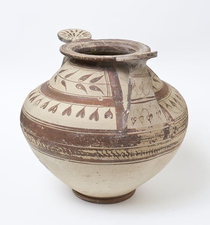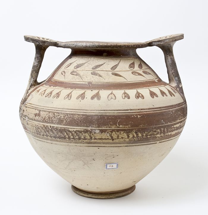 Olla in ceramica messapica con due anse verticali in forma di scalpello unite al labbro mediante rotella. Basso collo troncoconico a profilo convesso, corpo globoso, piede ad anello; una rientranza all’altezza del ventre a causa della cottura. Decorazione monocroma in bruno-rossiccio, su fondo naturale d’argilla, su entrambi i lati, sul collo, riquadro con ramo di foglie lanceolate; sulla spalla, foglie lobate su un lato, serti con foglie d’edera sull’altro; sul ventre, fasce di colore rossiccio; sulle rotelle, doppio giro di petali uscenti dal centro di esse; sulle anse, due riquadri separati da doppie linee parallele, con serti d’edera; orlo e piede interamente dipinti.