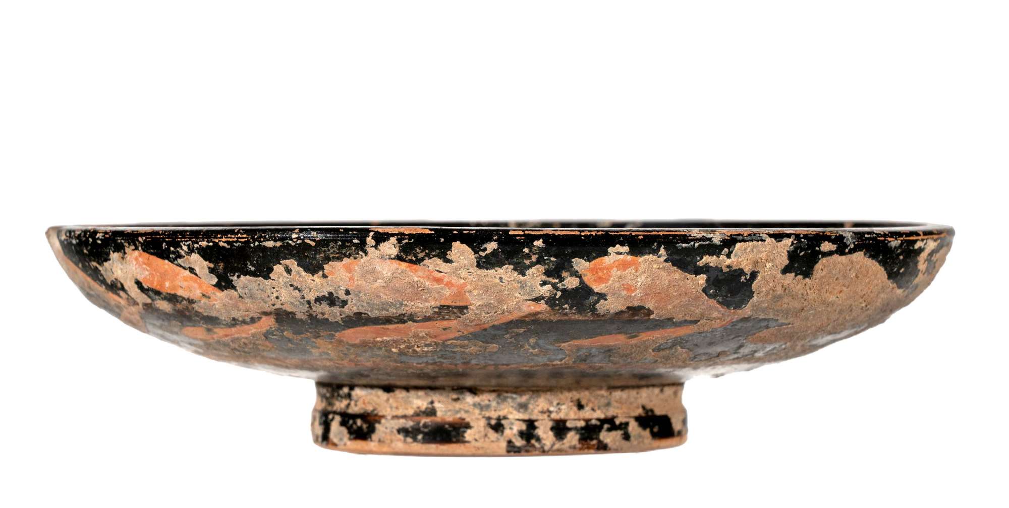 Piatto a figure rosse con polipo al centro e ramo d'alloro attorno.