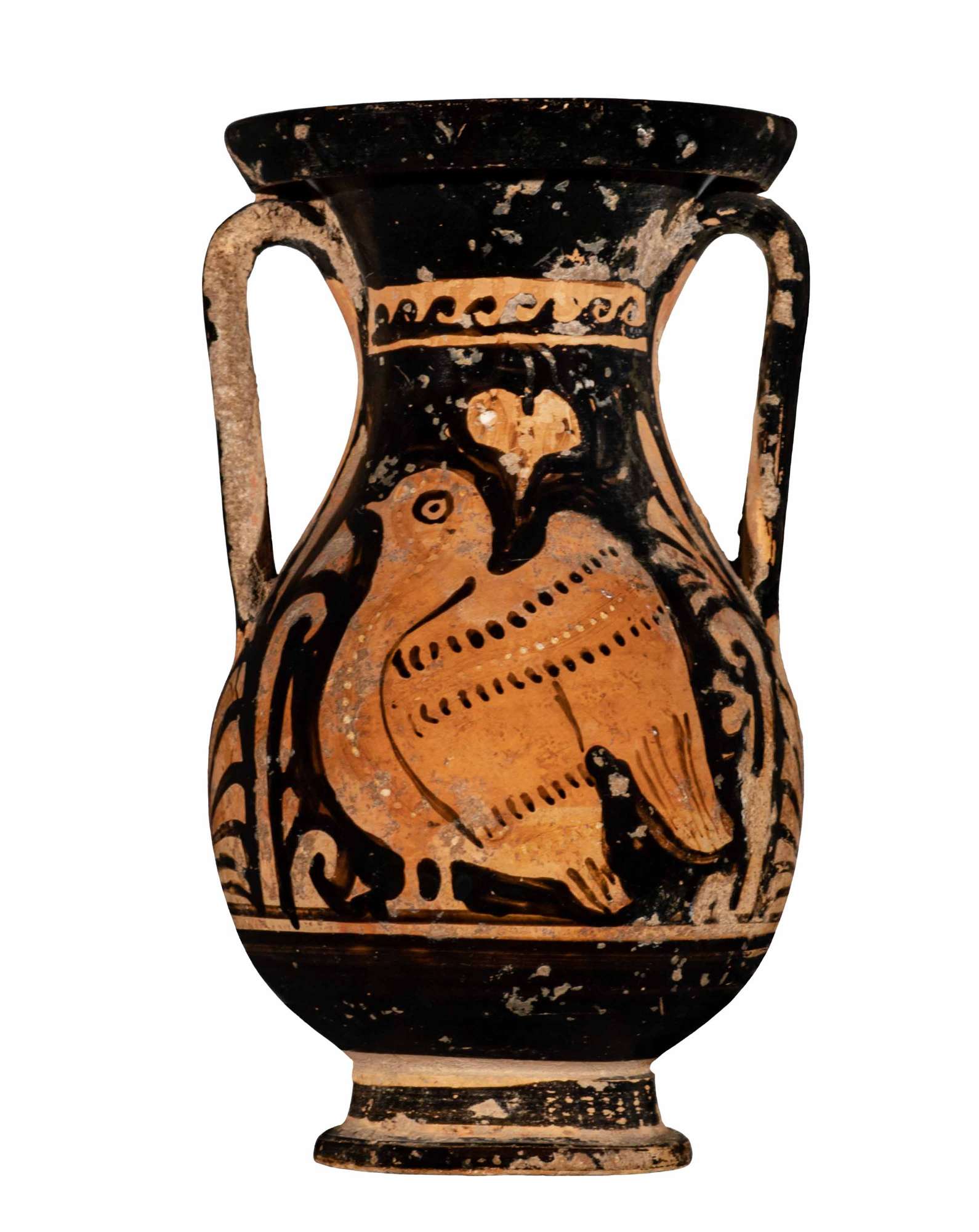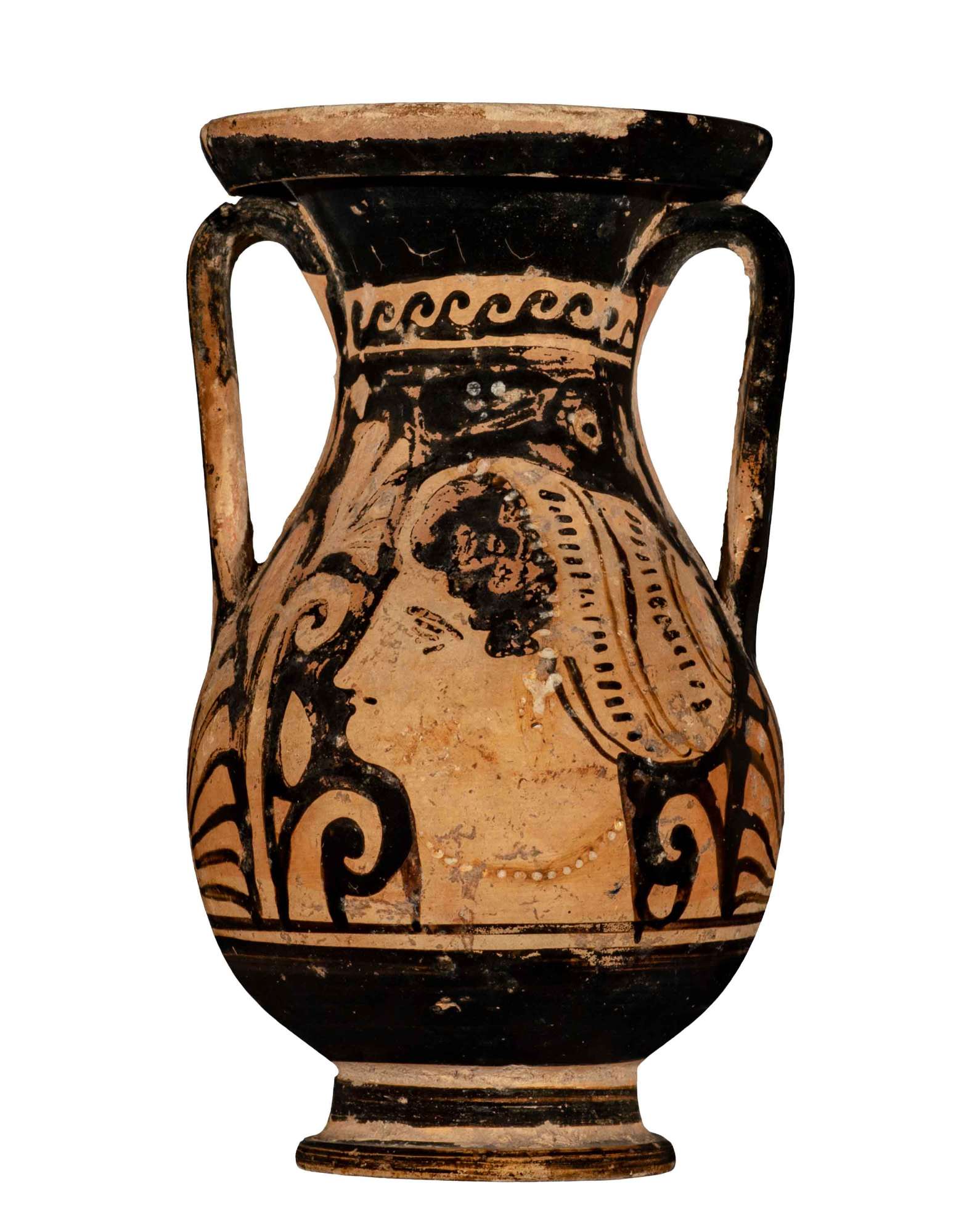 Orlo revoluto a profilo convesso con labbro estroflesso su collo a profilo concavo; spalla obliqua; corpo ovoide distinto dal piede da una sottilissima risega; anse verticali a nastro impostate tra collo e spalla; piede a campana modanato presso il bordo inferiore. Al di sotto delle figurazioni, corrente per tutta la circonferenza del vaso, sottile fascia risparmiata adiacente ad una fascia, dello stesso spessore, in vernice nera.  Lato A: testa femminile con stephanè. Testa femminile di profilo verso sinistra. La fronte e il naso sono costituiti da un’unica linea continua; occhio con dettaglio di sopracciglio arcuato, palpebra superiore, rima superiore e inferiore aperte e pupilla pendente dalla rima superiore. La narice non è contraddistinta da alcun tratto. Labbro superiore e inferiore distinti per mezzo di una breve linea diritta a vernice nera in parte evanida. I capelli, che fuoriescono solo presso la fronte, sono acconciati in un sakkòs, decorato, come una sorta di spirale su due registri, da una doppia linea nera continua alternata a una fila di lineette; al sakkòs è sovrapposta una stephanè sovradipinta in bianco quasi del tutto evanida; portata stretta all’altezza di metà collo, indossa una collana ad un unico filo di vaghi circolari sovradipinti e orecchini a rosetta costituiti da tre vaghi circolari accostati, sempre sovradipinti in bianco.  Lato B: colomba con foglia d’edera Colomba raffigurata con becco, occhio, corpo e zampe di profilo verso s. e ali pronte a spiegarsi viste di tre quarti da tergo; becco e zampe resi a risparmio; occhio costituito da un puntino tondo e da un cerchietto concentrico; il corpo è decorato da una fila di puntini sovradipinti in bianco e in parte evanidi che corrono attorno all’occhio fino al ventre. Nel campo, in alto, sopra la testa della colomba, foglia d’edera cuoriforme a risparmio.