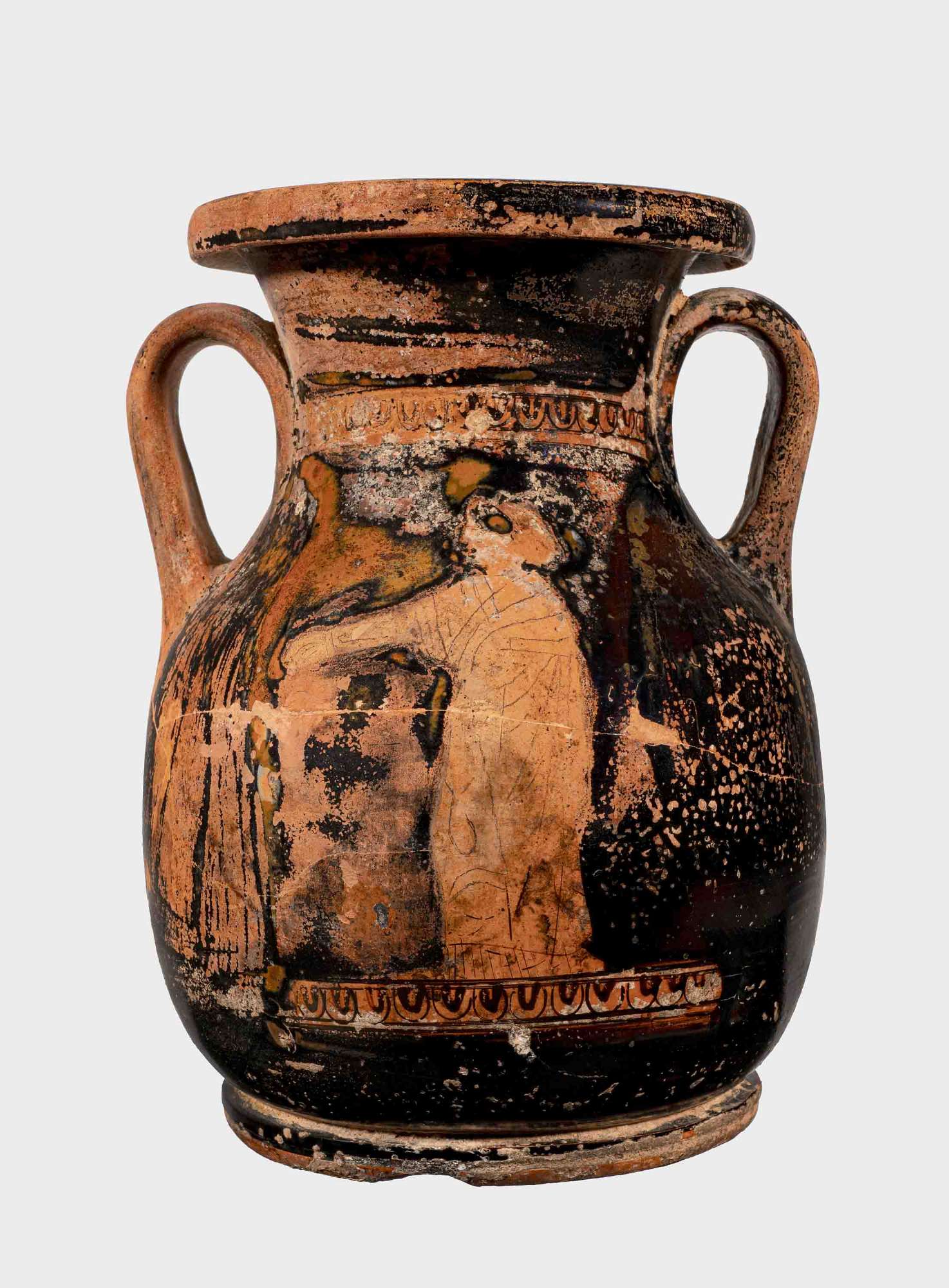 Pelike attica a figure rosse. Lato A: due figure femminili ai lati di una cassettina; sopra e sotto fascia di ovuli. Lato B: figura femminile stante.