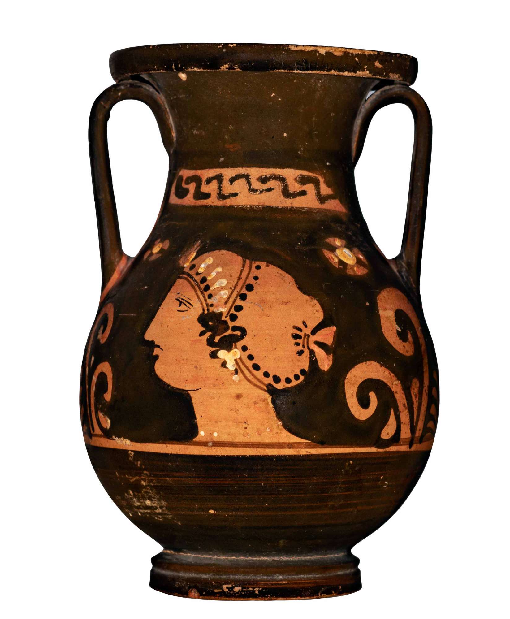 Orlo revoluto su collo a profilo concavo; spalla obliqua; corpo ovoide, distinto da una sottile linea graffita; anse verticali a nastro con lievissima costolatura mediana, impostate tra collo e spalla; Lato A: testa femminile con stephanè Testa femminile di profilo rivolta verso sinistra. Fronte e naso costituiti da un’unica linea continua; mezzo di una breve linea a vernice nera tendente verso il basso. Il mentoè abbastanza stondato. Un sakkòs, decorato sulla nuca con una corona di linguette e lungo la circonferenza da una doppia linea continua a vernice nera diluita e da una fila di pallini in vernice nera, copre i capelli, di cui fuoriesce solo una ciocca di riccioli neri all’altezza dell’orecchio. Al sakkòs è sovrapposta una stephanè ad alti raggi in bianco e giallo sovradipinto; indossa collana ad unico filo di vaghi circolari sovradipinti in bianco (in parte evanidi) e orecchini a rosetta costituiti da tre vaghi circolari accostati, in bianco e giallo sovradipinto. Nel campo, ai due lati della testa femminile, in alto, due rosette quadripetale Lato B: testa femminile con stephanè, il disegno rimanda lo stesso del lato A.
