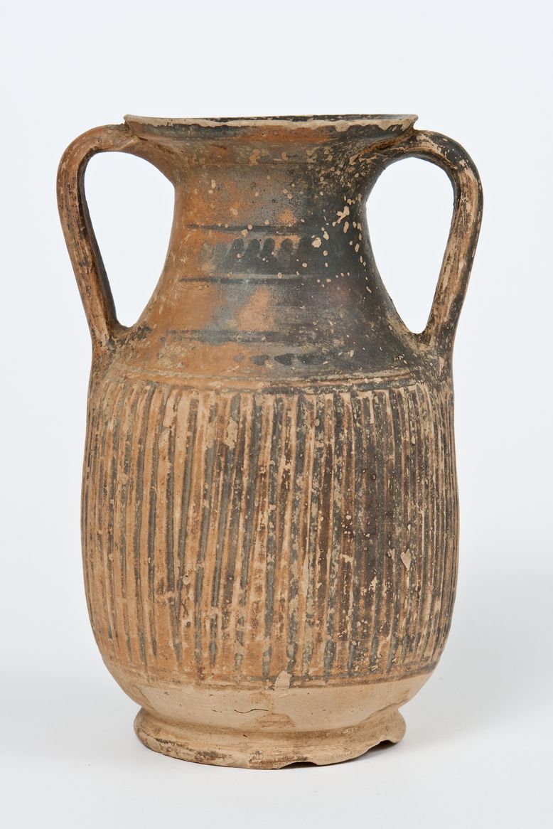 Pelike a vernice nera, tendente al bruno (forse particolarmente diluita), sovraddipinta. Labbro leggermente revoluto, orlo estroflesso, collo a profilo concavo, corpo cilindrico, con larghe strigilature e modanature, che lo inquadrano superiormente ed inferiormente, anse a nastro leggermente oblique ed adiacenti all’orlo, piede ad anello. Sul collo: tra una coppia di linee dipinte, motivo dell’onda segue un’altra coppia di linee e una fila di foglie cuoriformi, forse doveva trattarsi di un tralcio d’edera a stelo lineare dipinto.