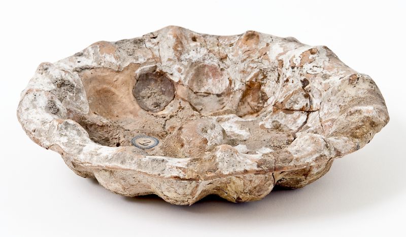 Phiale mesonfalica baccellata apula argentata. Bassa vasca emisferica, orlo ondulato ed estroflesso. All’interno, pomello rilevato al centro, baccellature concave profilate da un bordo incavato, tra le quali si dispongono, in corrispondenza dell’orlo, testine in rilievo; su un lato dell’orlo, due fori per la sospensione. La phiale presenta una spessa ingubbiatura biancastra di caolino a imitazione dei prototipi argentei.