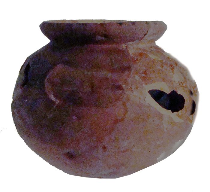 Pisside/vasetto acromo a corpo sferoidale, leggermente piriforme, collo inesistente e bocca estroflessa, piede svasato ad anello, tracce di vernice bruna.