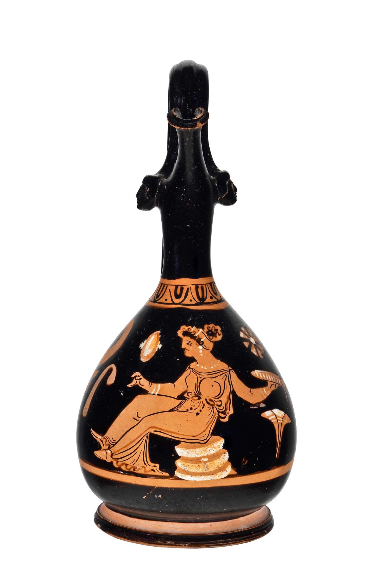 Epichysis apula a figure rosse piriforme, con becco semicilindrico allungato e ansa sormontante a nastro con protomi femminili all'attacco superiore. Donna seduta vestita di chitone con sperchio e phiale. Antefissa a palmetta sotto l'ansa.