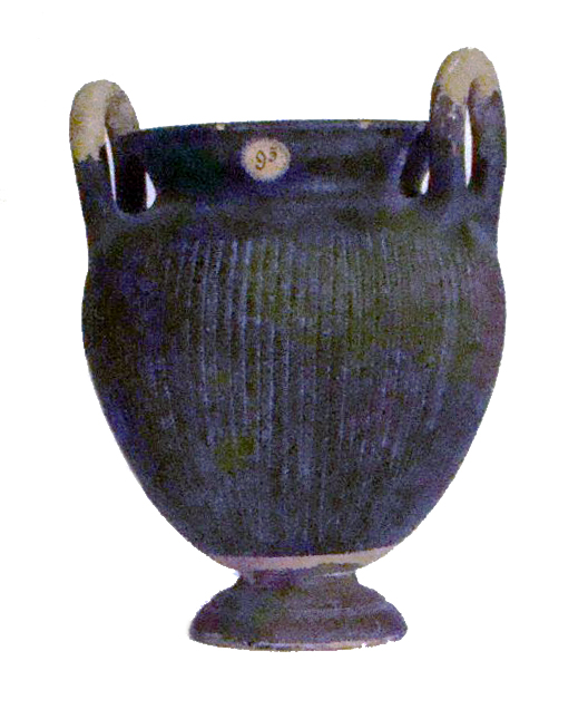 Stamnos a ventre baccellato e due alte anse arcuate verticali; vernice nera con sovraddipiuntura perduta (risparmiata la parte inferiore) con coperchio Grecia 956.