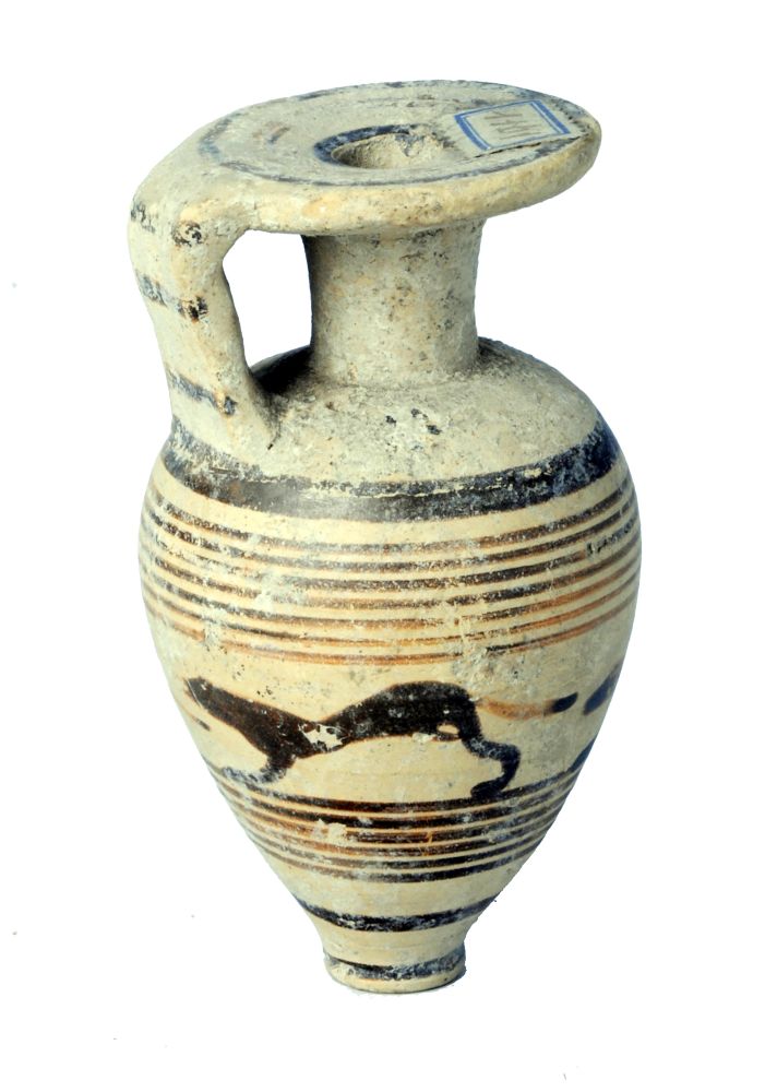 Aryballos piriforme rastremato verso il puntale a fasce con larga zona decorata da tre cani in corsa.
