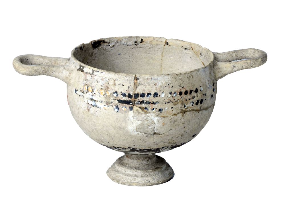 Coppa con due anse orizzontali su base modanata con decorazione a fasce ormai illeggibile
