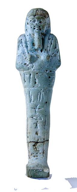 Statuina funeraria mummiforme che indossa una parrucca tripartita e la barba divina. Le mani incrociate e affiancate portano la destra una zappa e la sinistra un piccone. Dalla spalla sinistra pende una sacca. Il pilastro dorsale è presente e forma un tutt’uno con la piccola base. L’iscrizione frontale è a forma di T.