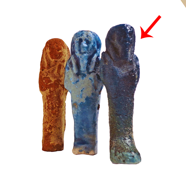 Statuina funeraria mummiforme che indossa la barba divina e una gonfia parrucca tripartita, la quale è stata rifinita nella parte posteriore. Le mani incrociate portano una zappa e forse una frusta. Dalla spalla sinistra pende una sacca. L’ushabti è privo di iscrizioni e date le ridotte dimensioni potrebbe essere stato usato come amuleto.