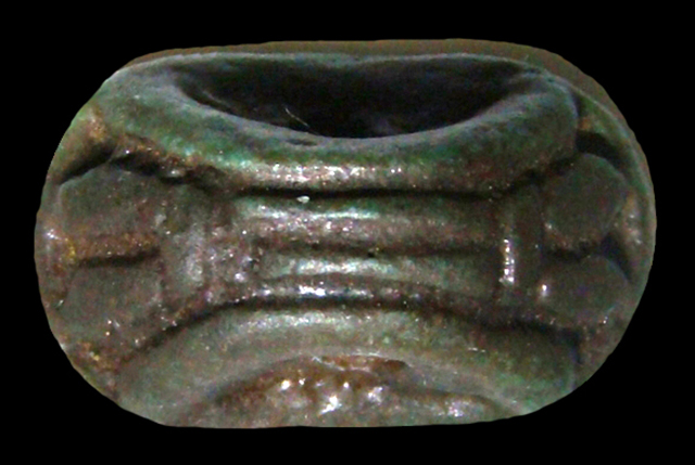 Sigillo in faience verde, con grafia corrotta del nome Amon-Ra, e il segno della canna fiorita raddoppiato. Dorso decorato da motivi vegetali stilizzati. Presa trasversale sul dorso.