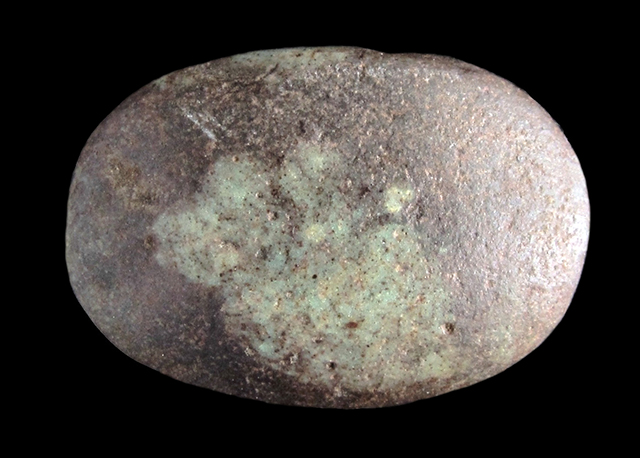 Scaraboide in faience; Sul ventre è rappresentata una sfinge alata con accanto segni geroglifici. Il dorso è molto consumato ed ormai liscio; il colore originale doveva essere verde chiaro. Foro passante longitudinale.