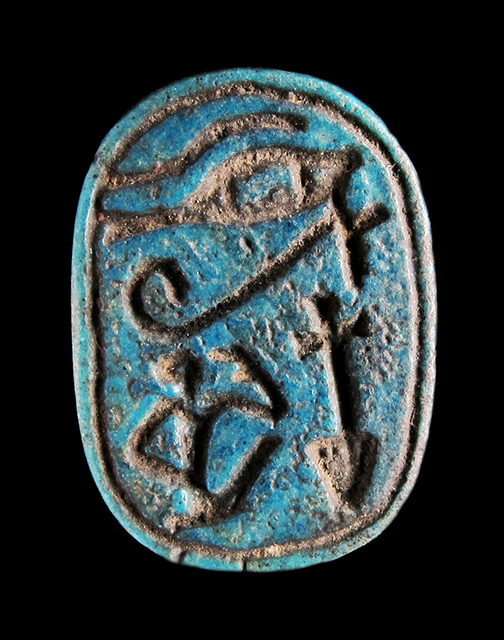 Scarabeo in faience turchese, con sul entre raffigurazione di un ugiat, sotto il quale vi è a destra un segno nefer e a sinistra il segno dell’uomo seduto con la mano alla bocca; si tratta forse dell’augurio “Salute e bene!”. Dorso con clipeo ed incisione a T per dividere il protorace e le elitre che presentano tacche a V. Foro passante longitudinale.